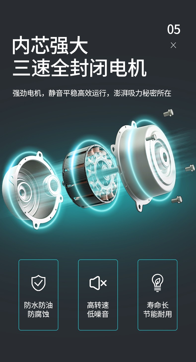 2、配置专利三层高纯铝油烟分离油网,油脂分离度99%。